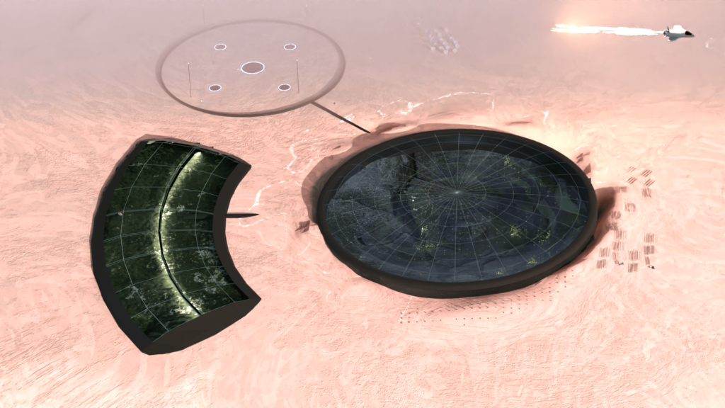 To develop a full sustainable society, we foreseen the foundation of two cities. Named as Koemitan and Nahootsoii, these twin cities will be placed at different places on the Mars surface to reduce risk and improve access to natural resources.
